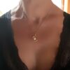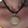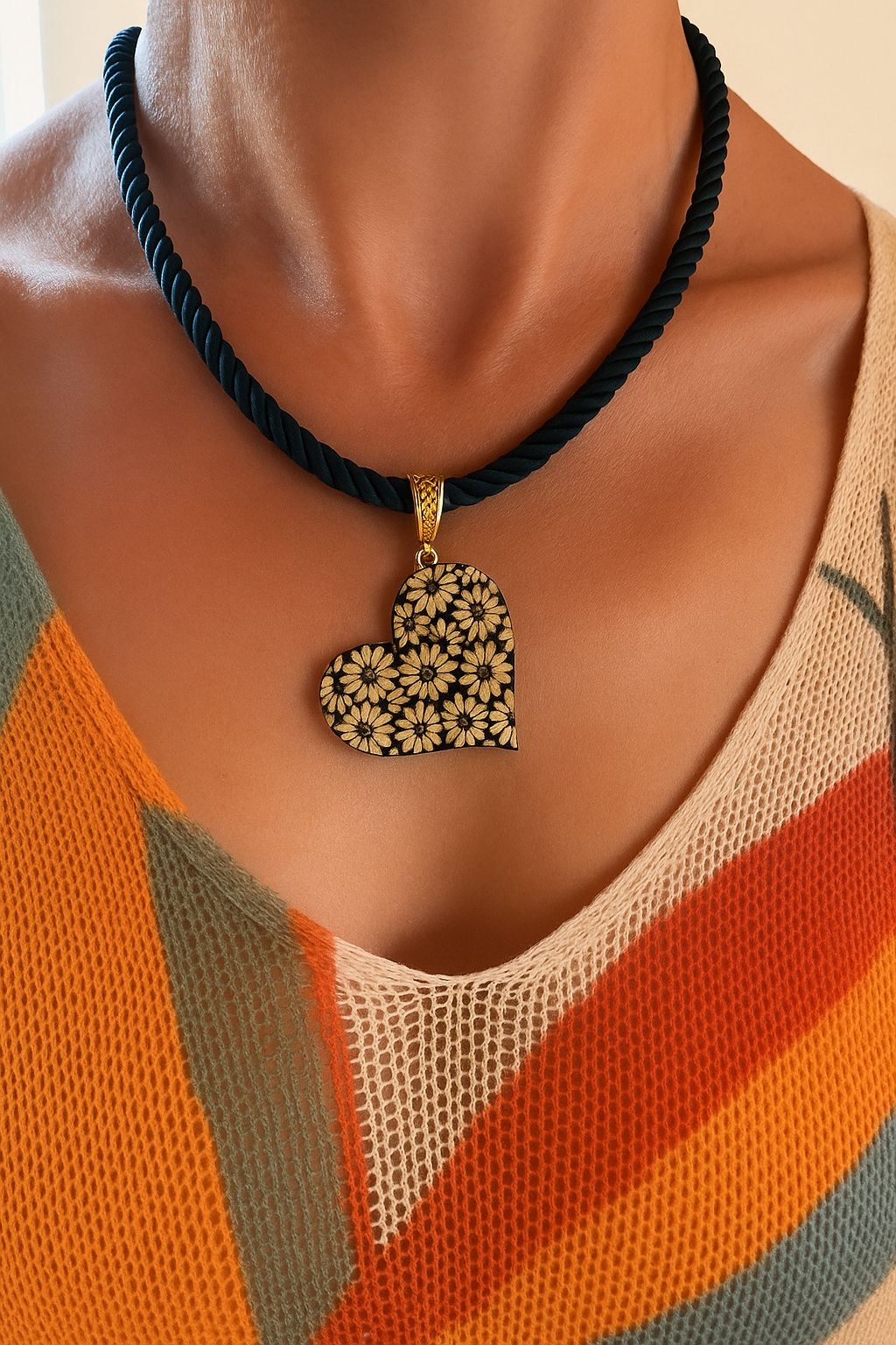 un coeur fleuri en bois gravé délicatement au laser, monté sur un cordon torsadé noir, fermeture mousqueton pour un look à la fois doux et affirmé