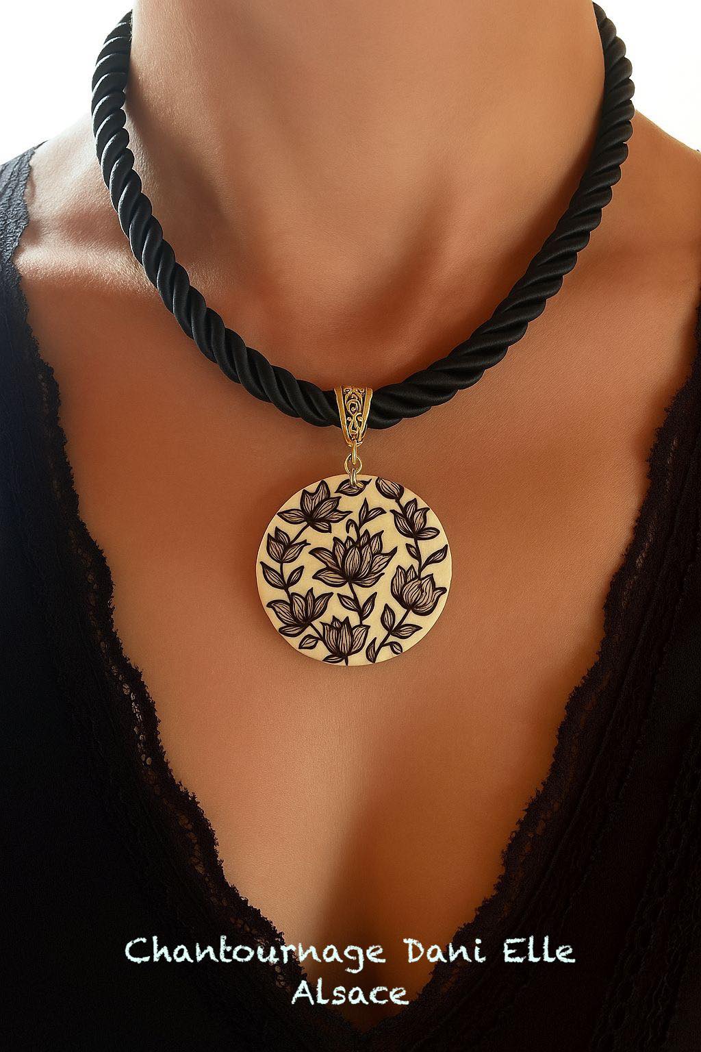 Collier en cordon torsadé noir lg 42 cm, orné d’un médaillon fleuri en bois gravé au laser, une pièce douce et poétique